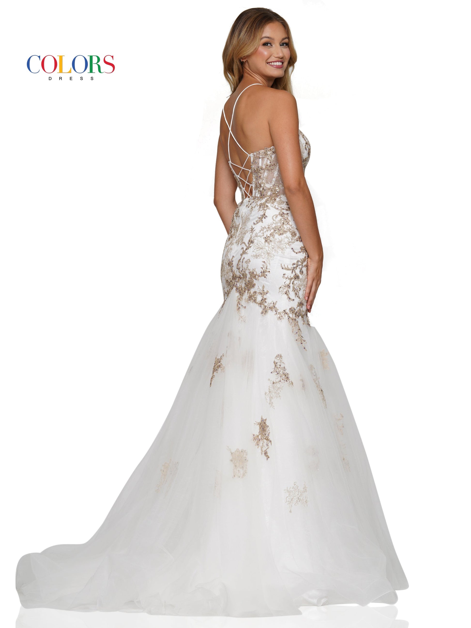 With our Colors 3198 Formal Long Spaghetti Strap Prom Dress. indulge in glitz! The corset back creates a fit-and-flare masterpiece by highlighting the allure of lace and embroidered tulle. This dress is ideal for your special prom night and invites you to embrace sophistication and style at every turn. Allow the magic to happen!