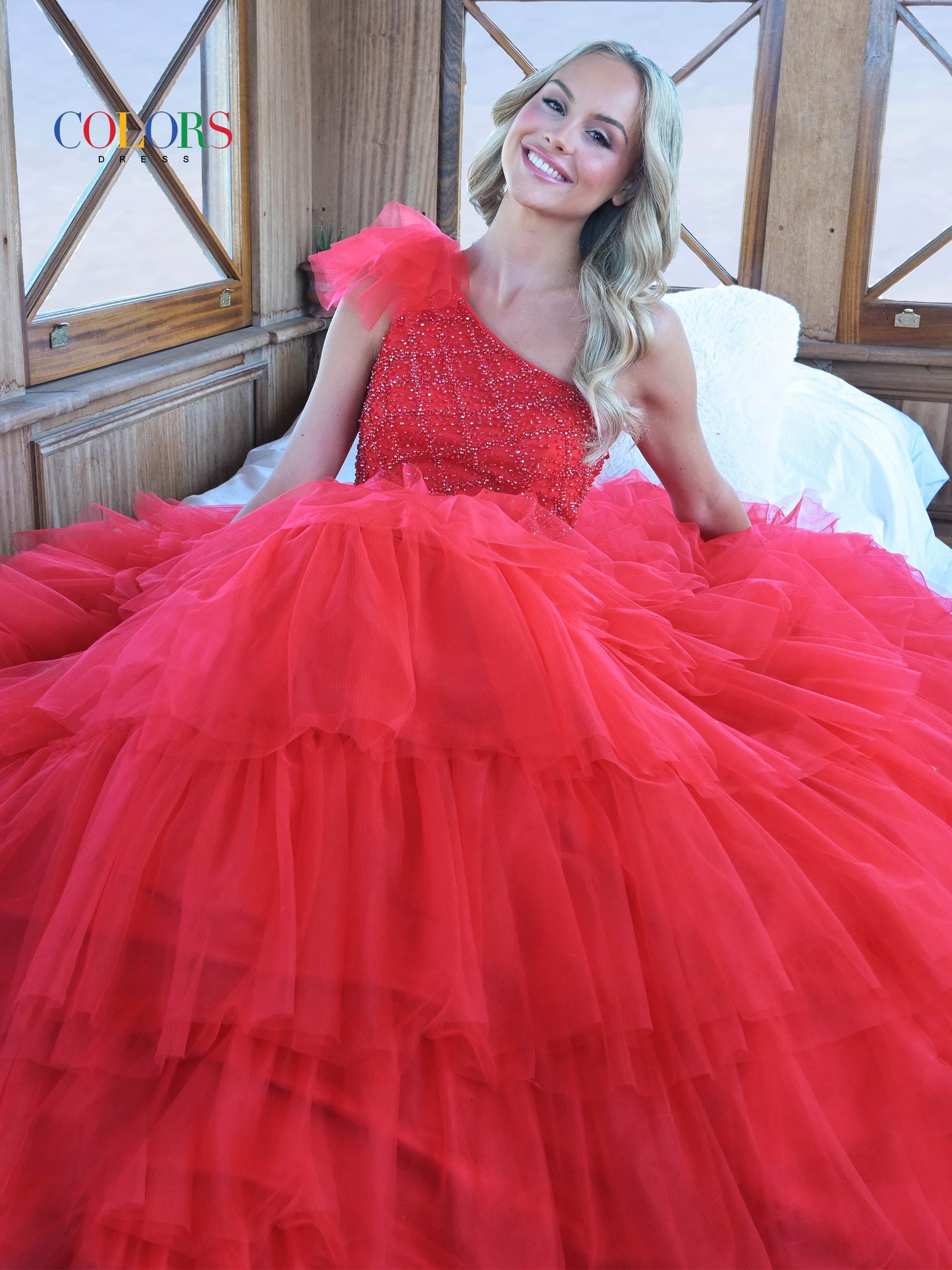 In our Colors 3218 Prom Long One Shoulder Beaded Mesh Ball Gown. exude beauty! It's a charming ball gown. embellished with beaded mesh. flowing tulle. and a ruffled skirt. Prepare yourself for a spectacular prom night full of glitz. confidence. and style that will make you stand out with elegance and charm!